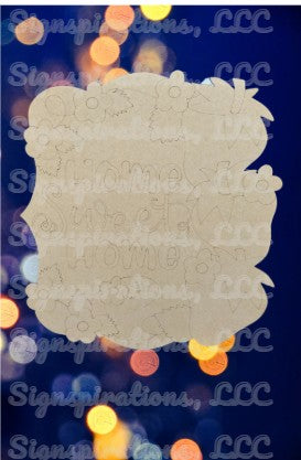 This unfinished MDF wood cutout features a beautifully scalloped square shape with raised laser-cut script lettering and floral embellishments across the top and bottom. The layered elements add dimension, while the clean, unfinished wood surface is ready for paint, stain, vinyl, or mixed-media customization.